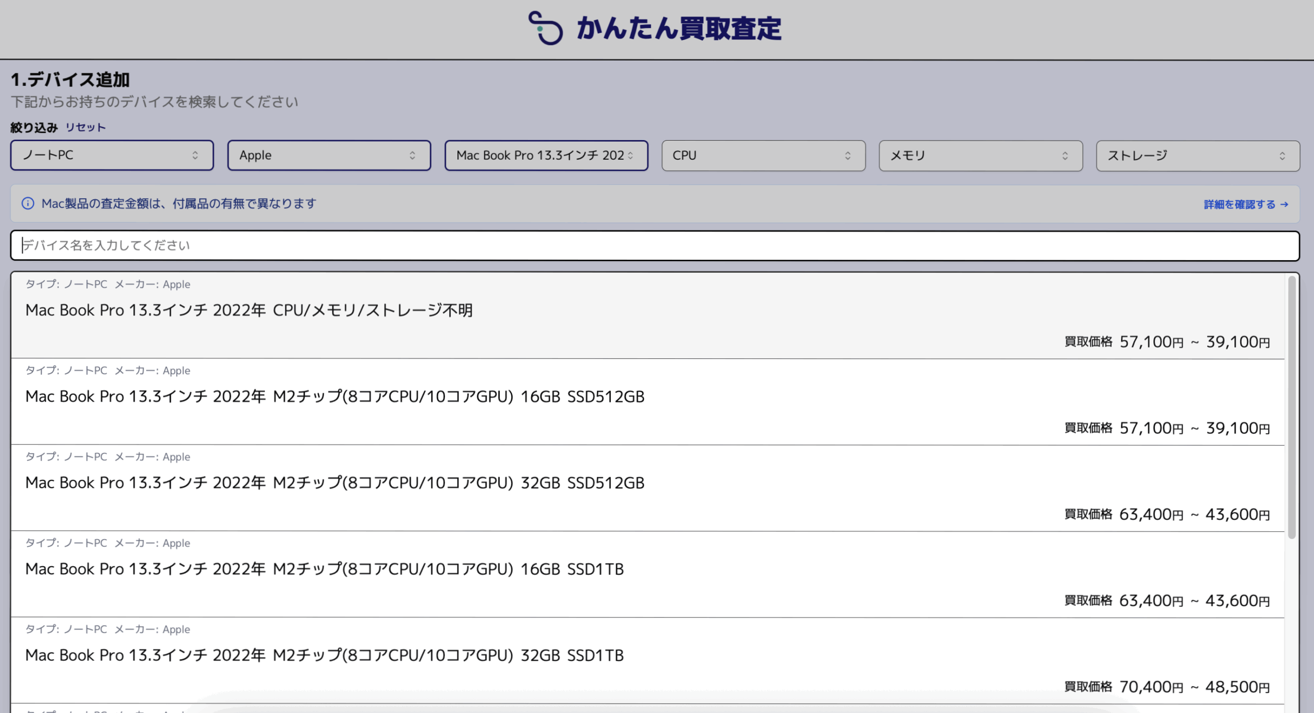 「1.デバイス追加」のメニューから、お持ちのMacのモデル名を選択すると、スペック別の価格が表示されます。